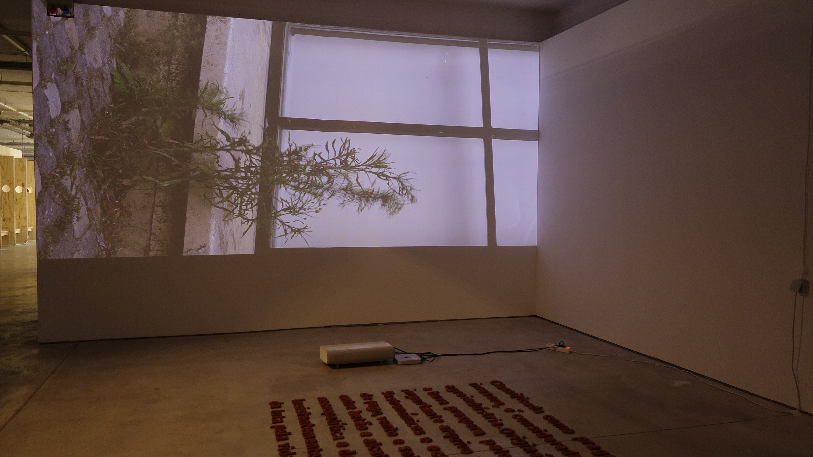 The installation combines a video projection on the wall with an excerpt from an arborography composed of fired clay letters arranged on the floor, evoking a gesture of burial – a conceptual and politically engaged, sensitive proposal to make earth from earth.