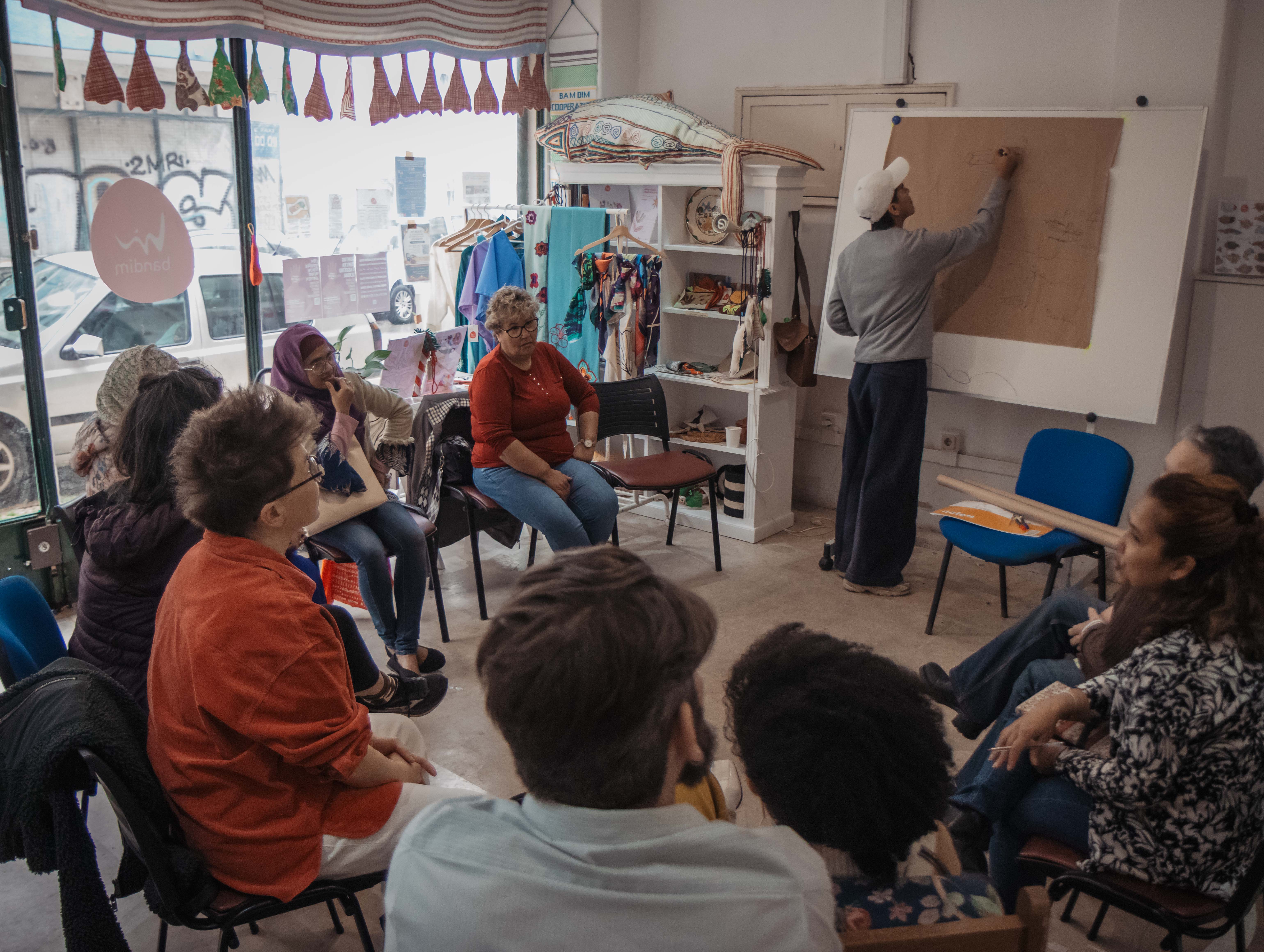 Cooperativa Bandim, uma plataforma de criação têxtil formada por mulheres migrates articula formação em costura, produção artesanal e criação artística. Desde 2023 a Bandim conta com 80 cooperantes de 21 nacionalidades.